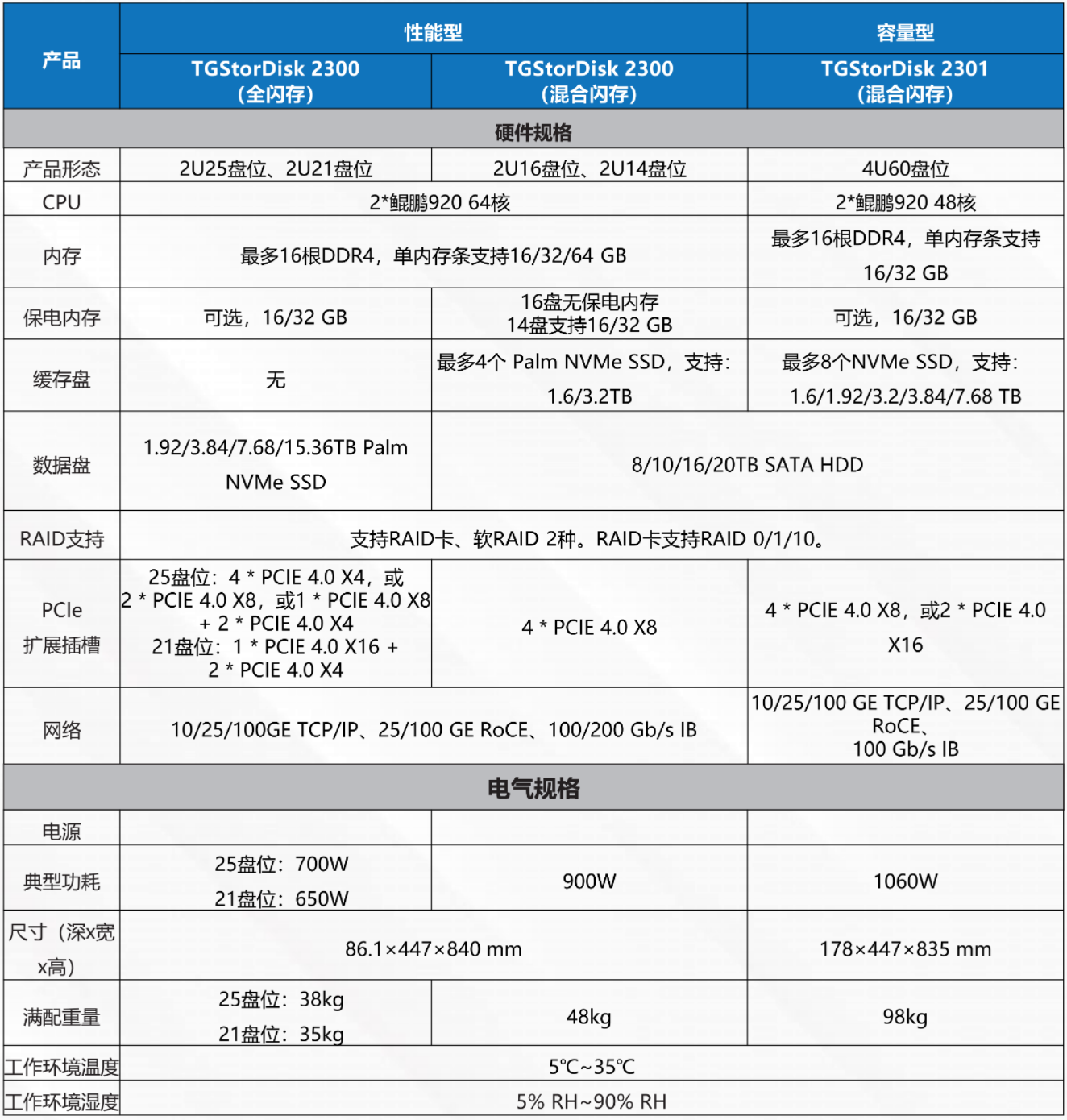 相比通用服务器,TGStorDisk 2300系列智能盘框最大可节省70%机柜空间、60%能耗。